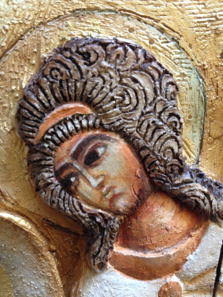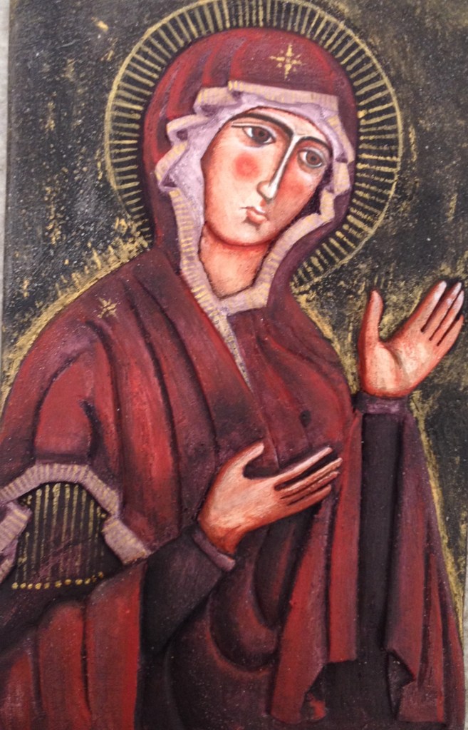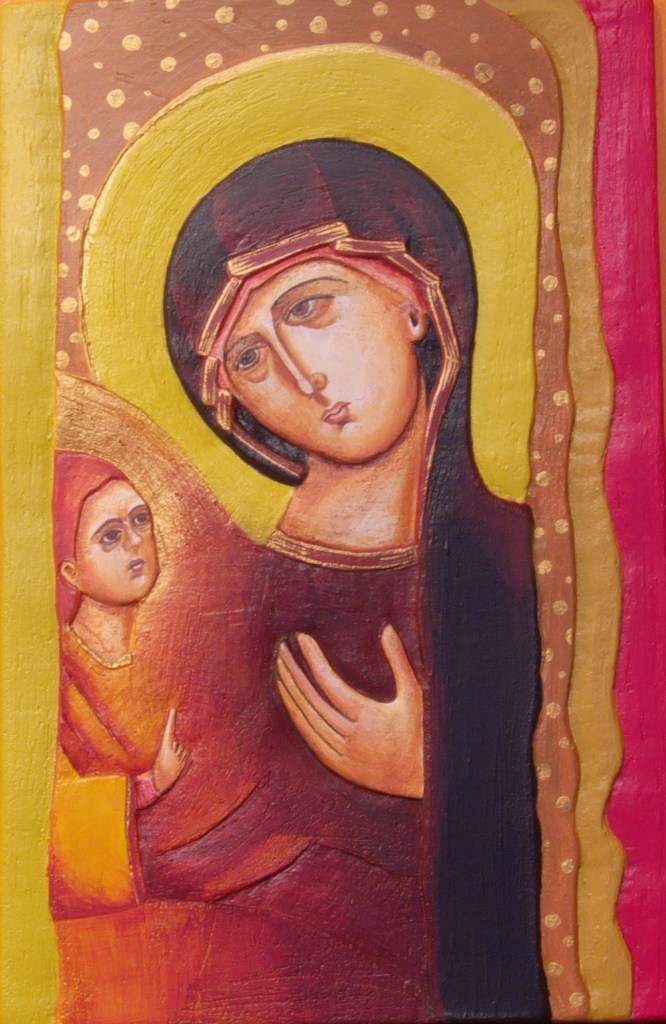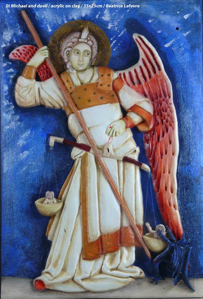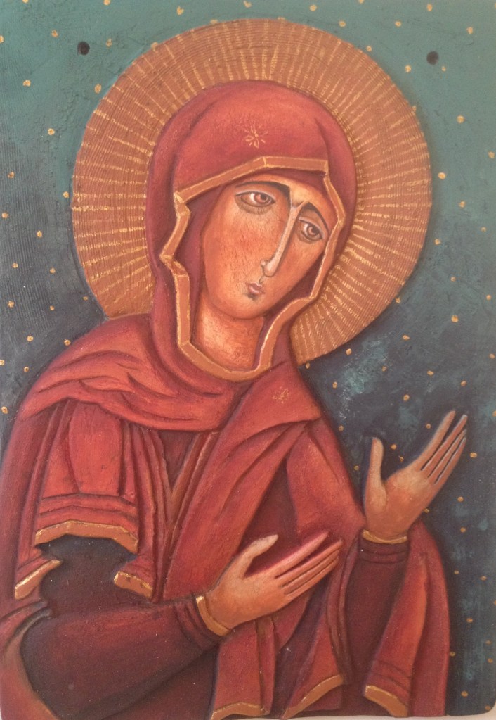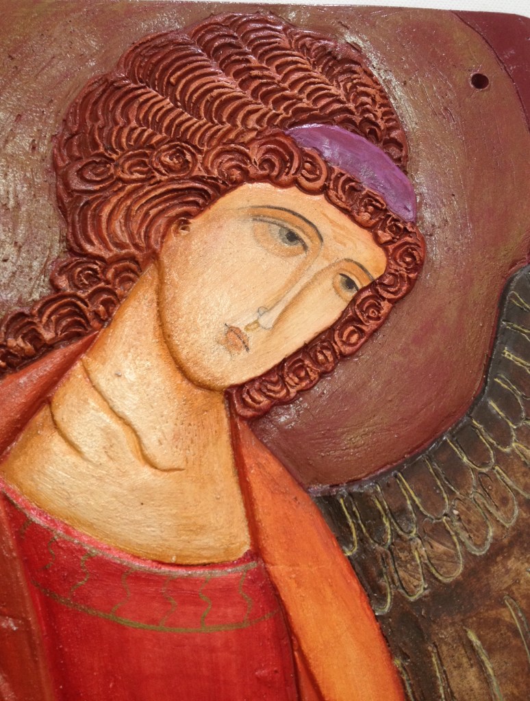 My icons are not traditional in a sense that I carve them on a clay slab as a base-relief, but also and essentially because they follow first the heart’s inspiration before the established rules in this type of art. Through forms and colours, I look for the icon’s spirituality which ” reveals us men and women showing human beings transcendental beauty, and moving in a universe that radiates peace and serenity “.