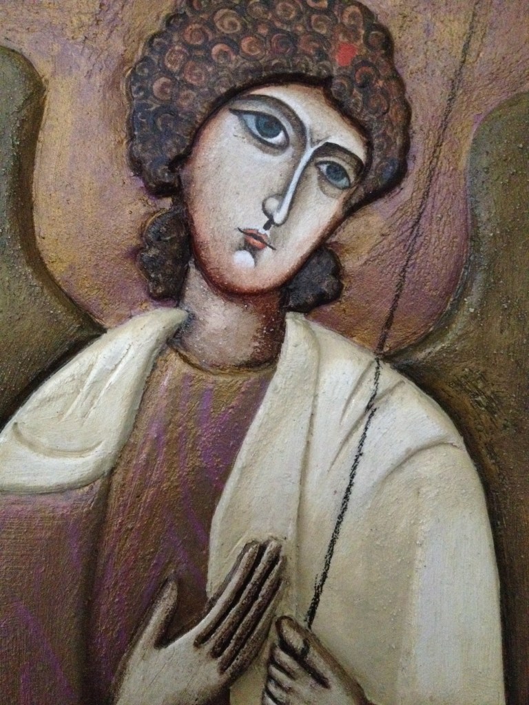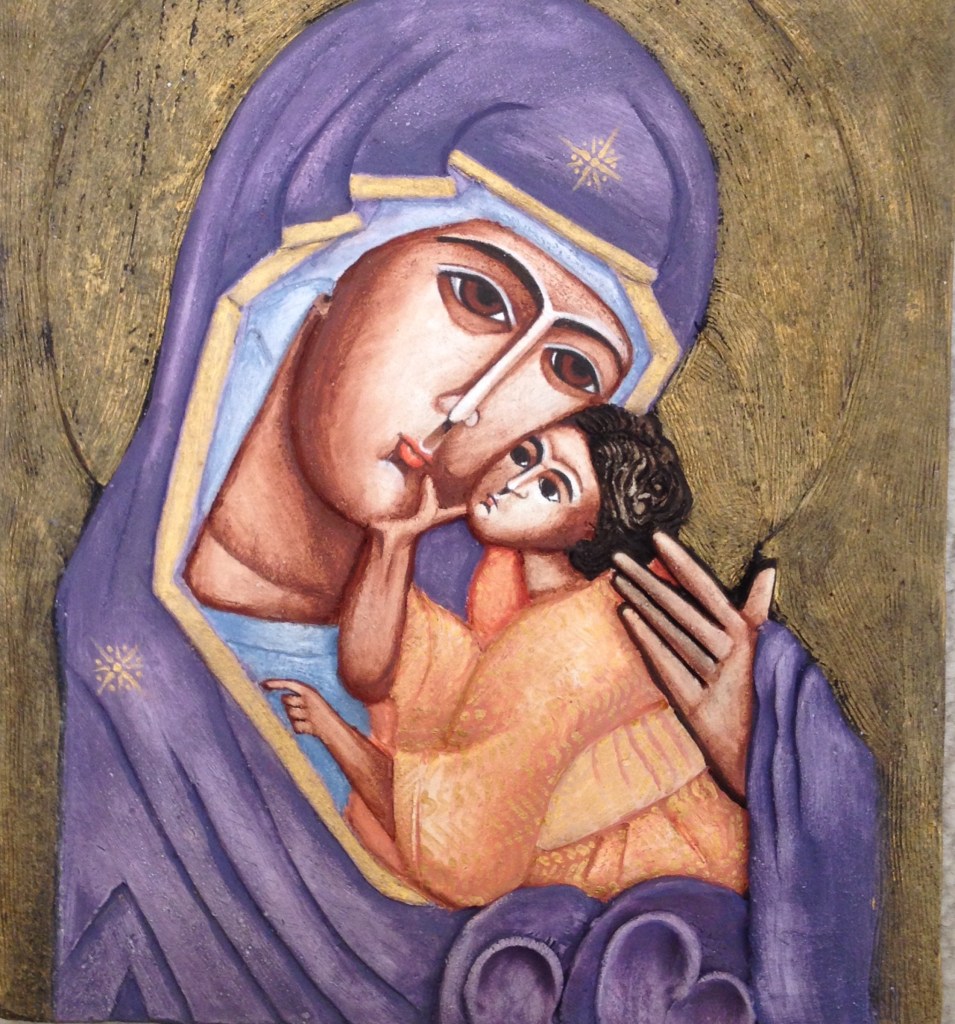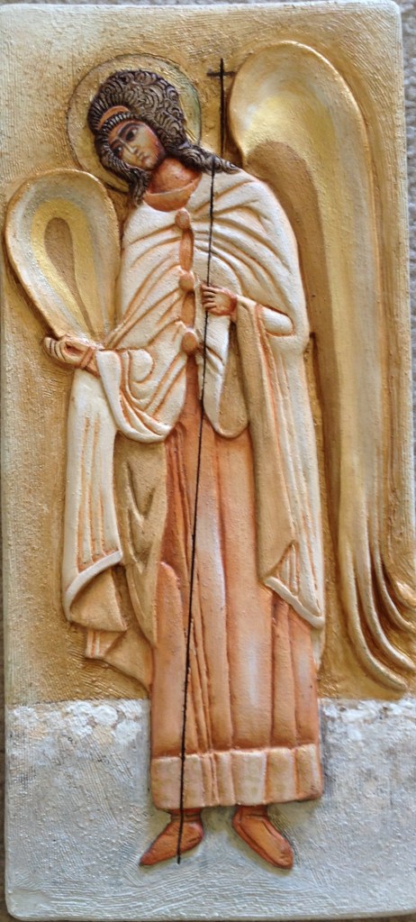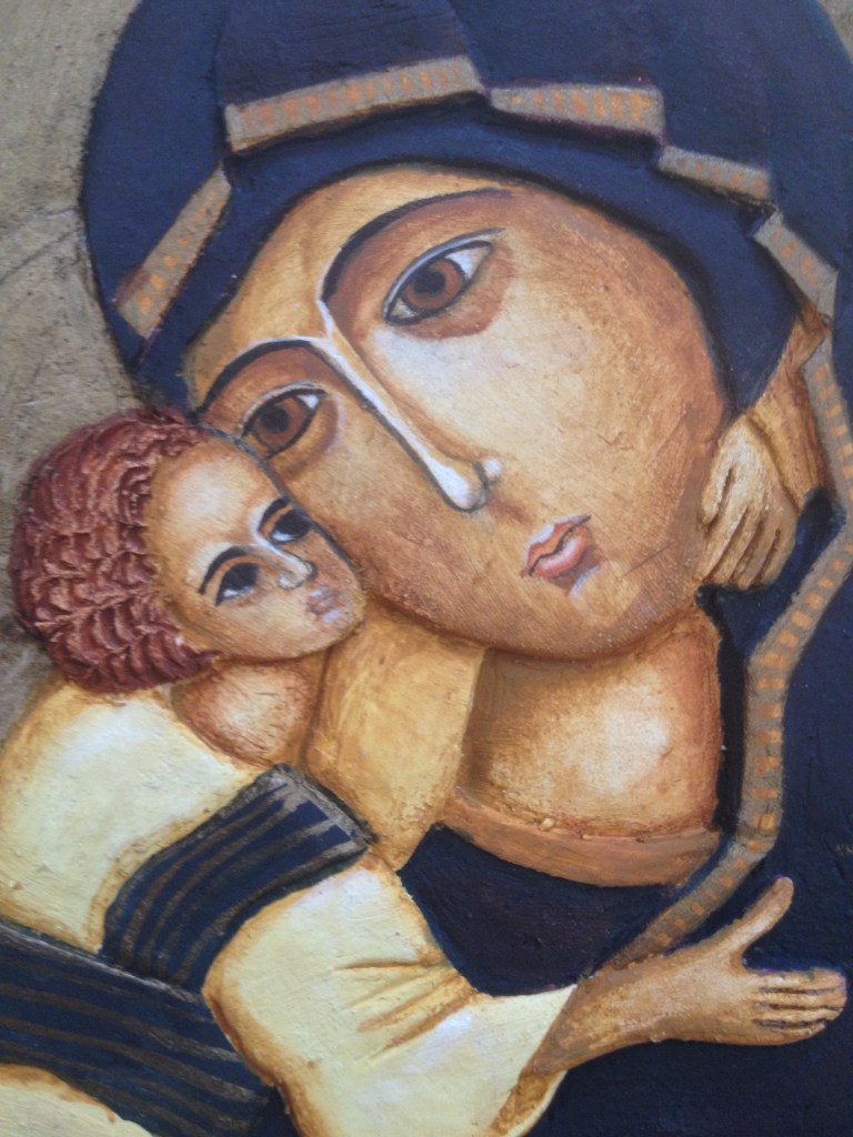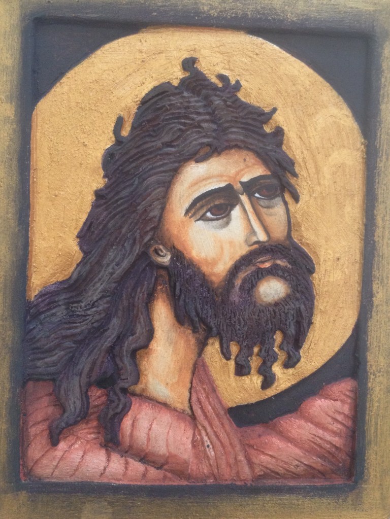My icons are not traditional in a sense that I carve them on a clay slab as a base-relief, but also and essentially because they follow first the heart’s inspiration before the established rules in this type of art. Through forms and colours, I look for the icon’s spirituality which ” reveals us men and women showing human beings transcendental beauty, and moving in a universe that radiates peace and serenity “.